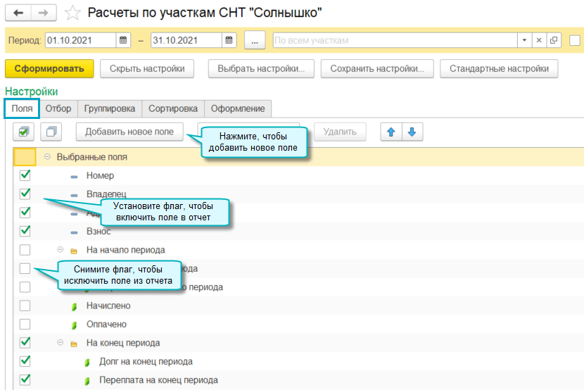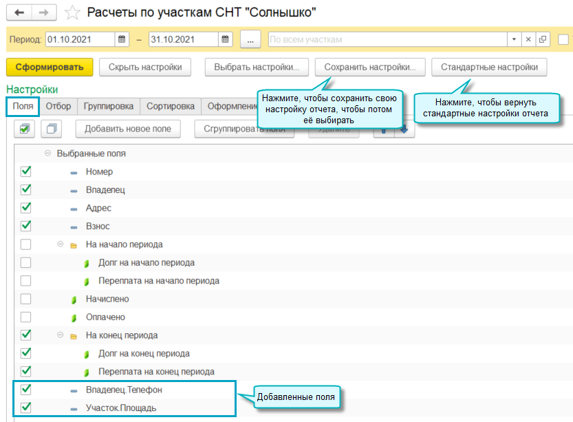 Добавлена возможность включать дополнительные колонки в отчеты Расчеты по участками и Расчеты по взносам, например, сведения о номере телефона владельца участка, площадь участка и другие. Также можно настроить и сохранить свой вариант отчета, вернуться к стандартным настройкам отчета.