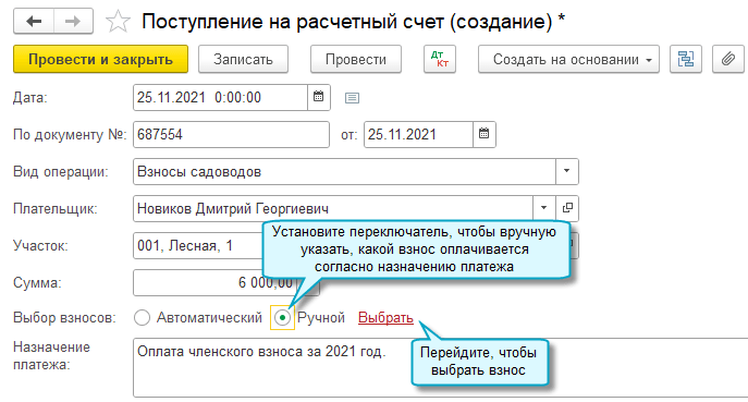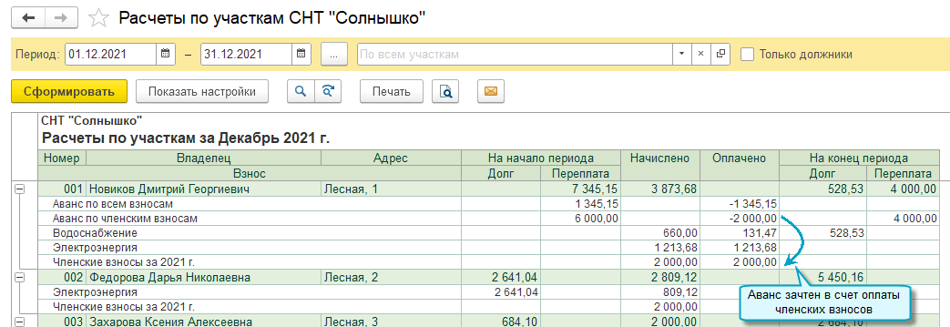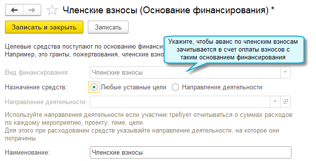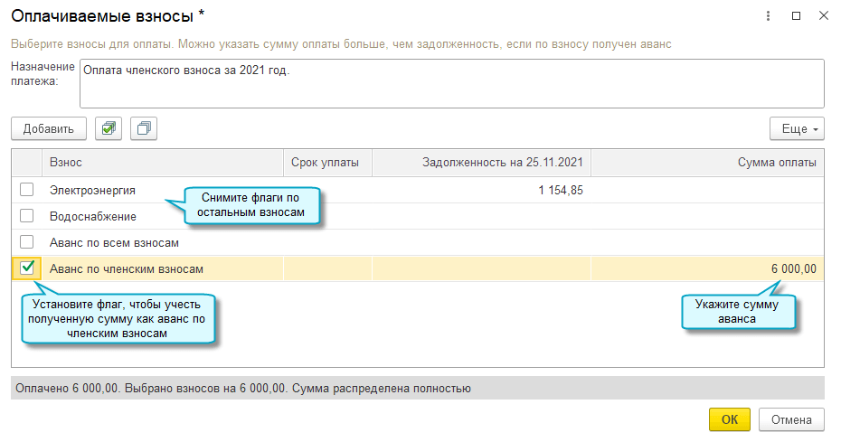 Добавлена возможность обособленного учета аванса по членским взносам. Аванс зачитывается только в счет оплаты членских взносов.