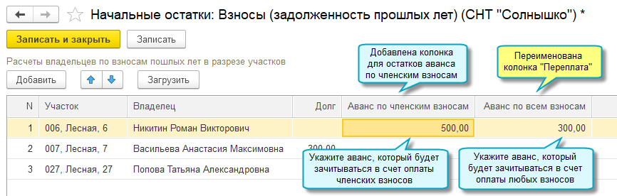 Расшифруйте остатки полученных авансов, если вы только начинаете вести учет в 1С:Садовод.