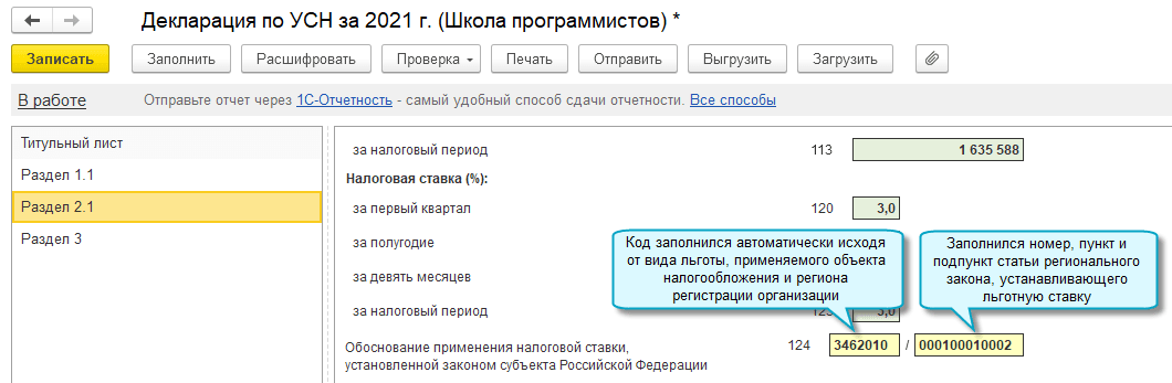Добавлена возможность автоматического заполнения обоснования применения льготной ставки УСН в налоговой декларации, которая представляется в ФНС начиная с отчета за 2021 год (Приказ ФНС России от 25.12.2020 № ЕД-7-3/958@).