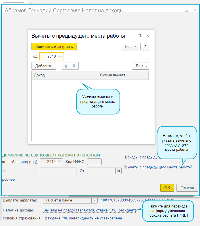 Добавлена возможность учитывать вычеты с предыдущего места работы при расчете НДФЛ. Информация о вычетах с предыдущего места работы записывается в справочник сотрудника.
