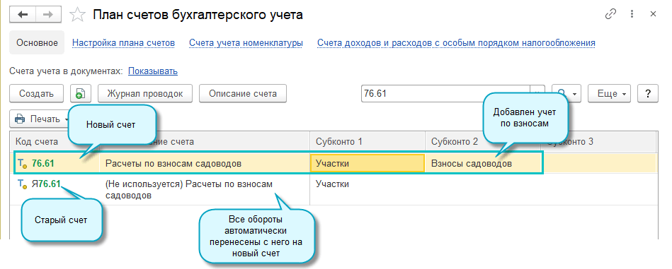 Учет задолженности садоводов ведется на счете 76.61 "Расчеты по взносам садоводов" в разрезе участков и взносов