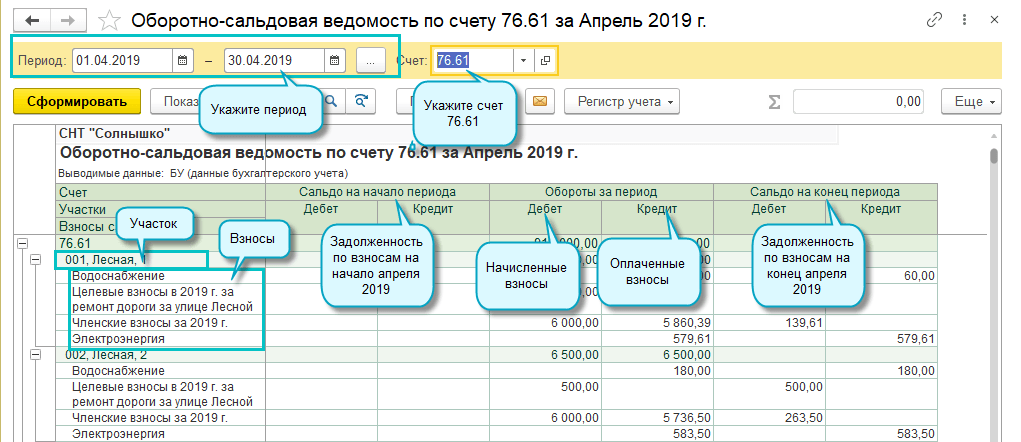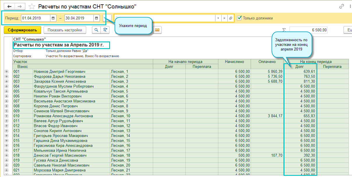 Отчеты по расчетам по участкам и по взносам формируются не только на текущую дату, но и за любой период