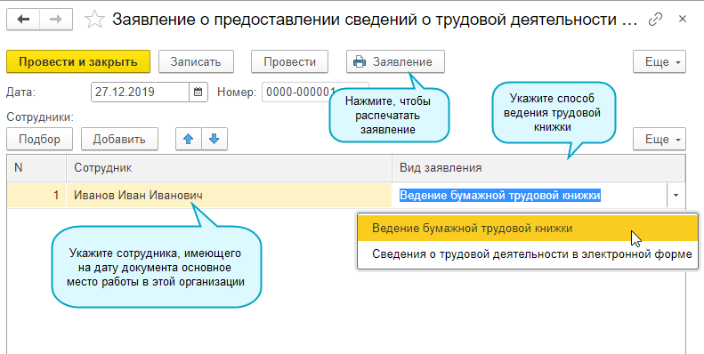 Добавлен документ "Заявление о предоставлении сведений о трудовой деятельности" и журнал "Электронные трудовые книжки". До 01.07.2020 работодателю необходимо уведомить сотрудников о желательности написания заявления о ведении трудовой книжки в электронном или бумажном виде. Заявления желательно подать до 31.12.2020.