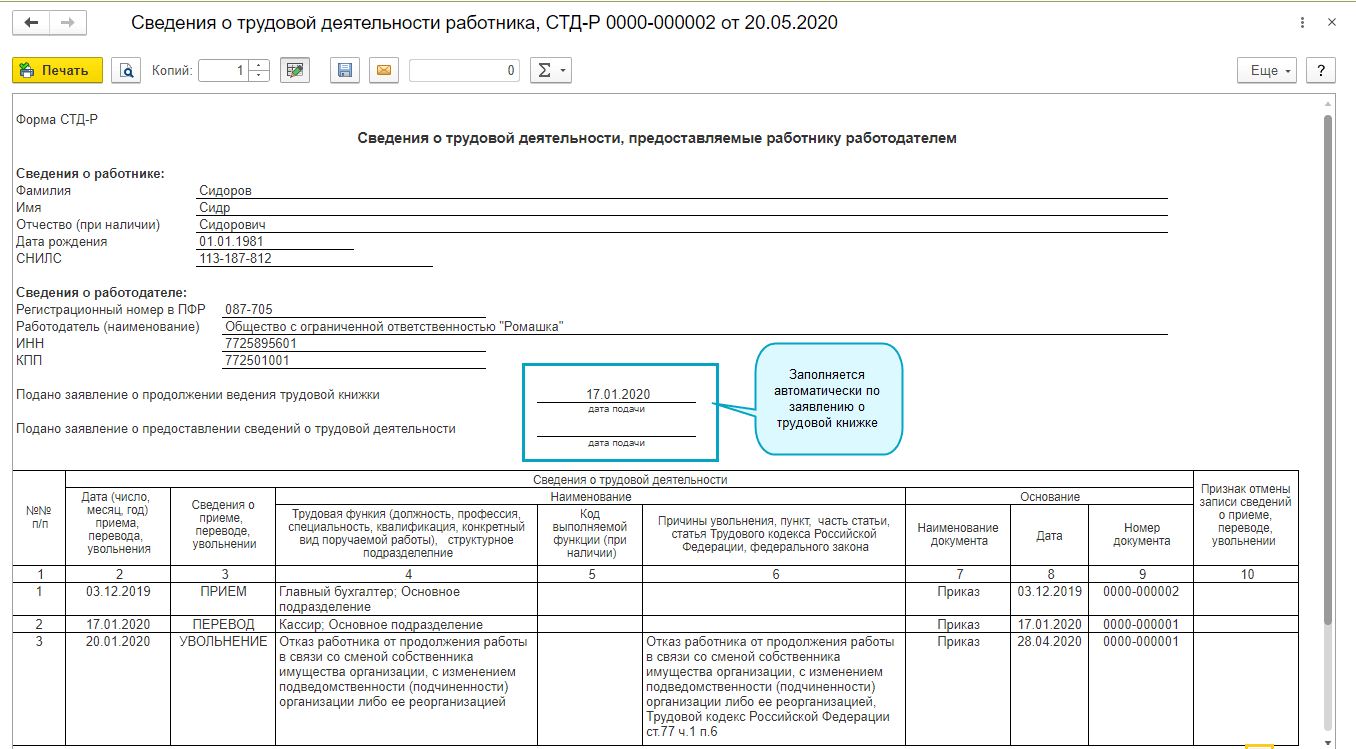 Добавлен документ Сведения о трудовой деятельности работников СТД-Р, а также печатная форма. С 01.01.2020 по этой форме выдается информация о трудовой деятельности за период работы в организации. Ее нужно выдавать по запросу работника и при его увольнении.