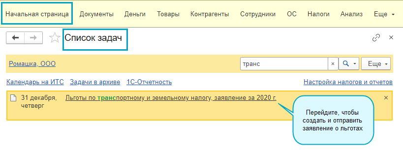 Если указать сведения о льготах по транспортному и земельному налогу, то в списке задач появится заявление о льготах.