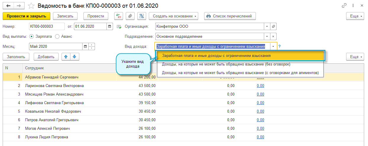 Добавлена возможность указать код дохода при выплате зарплаты через банк в документе Ведомость в банк (Указание ЦБ РФ от 14.10.2019 № 5286-У).