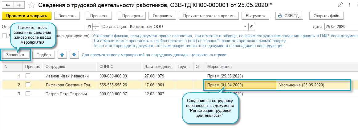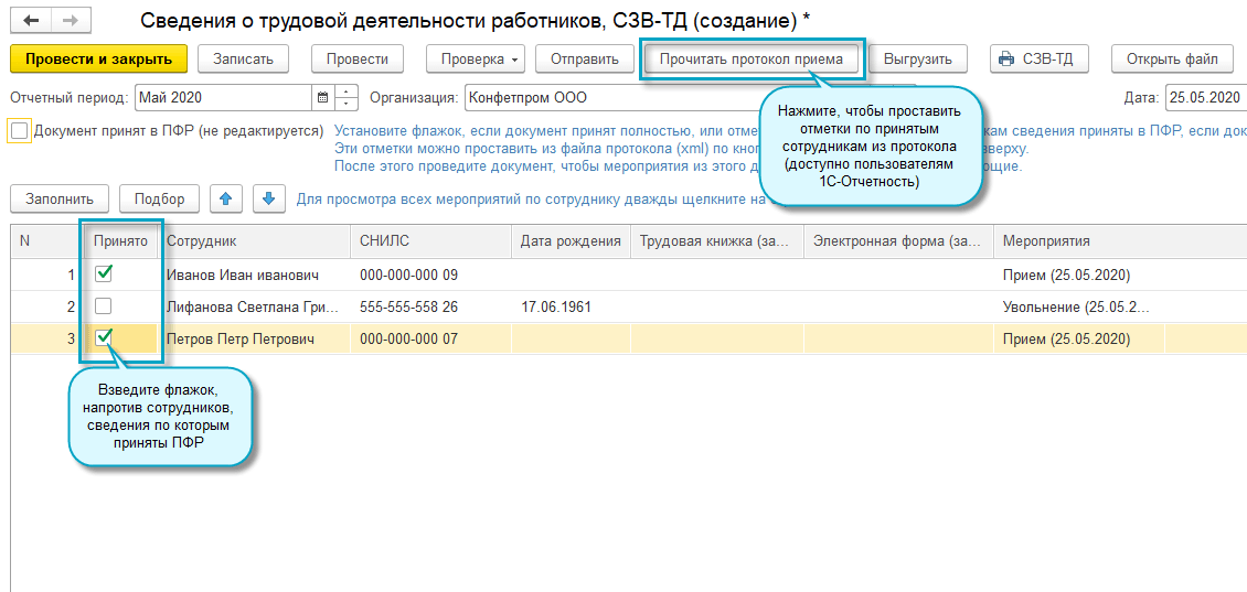 Добавлена возможность отметить сведения СЗВ-ТД как принятые ПФР не по всем сотрудникам, а только по сотрудникам без ошибок.