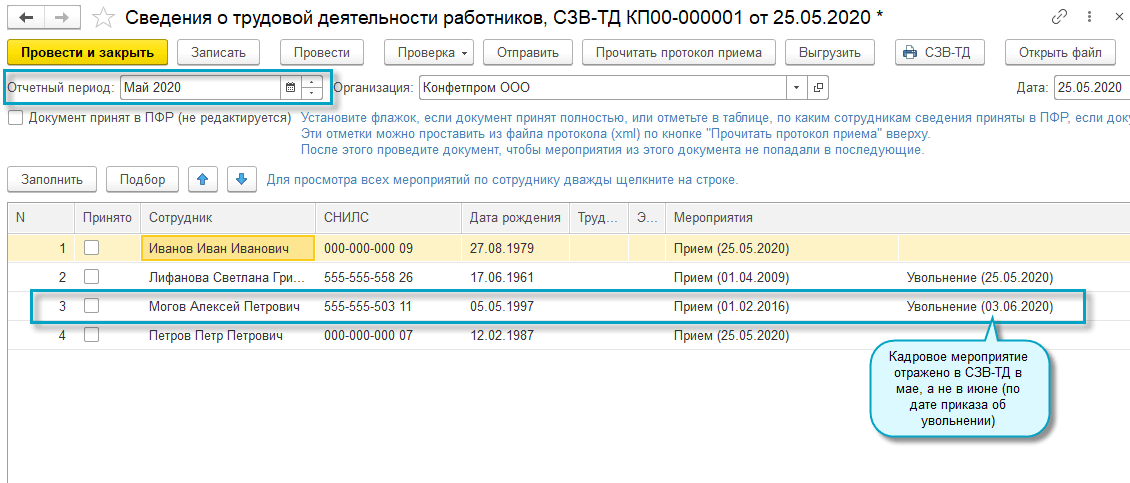 Добавлена возможность сформировать и отправить СЗВ-ТД с кадровыми мероприятиями, в которых дата приказа и дата увольнения/приема приходятся на разные месяцы.