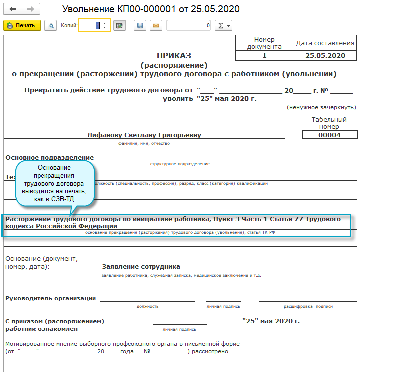 Основание увольнения в печатной форме кадрового приказа приведено в соответствие с порядком его вывода в СЗВ-ТД (без сокращений).