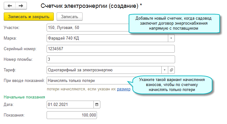 Простой интерфейс: меню "Участки - Электроэнергия - Новый счетчик".