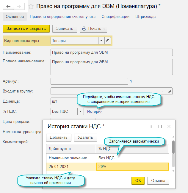 Добавлена возможность заполнять в документах ставку НДС значением, действующим на дату документа.