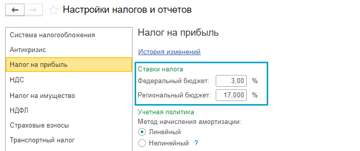 Простой интерфейс: меню "Налоги - Настройка налогов и отчетов - Налог на прибыль".