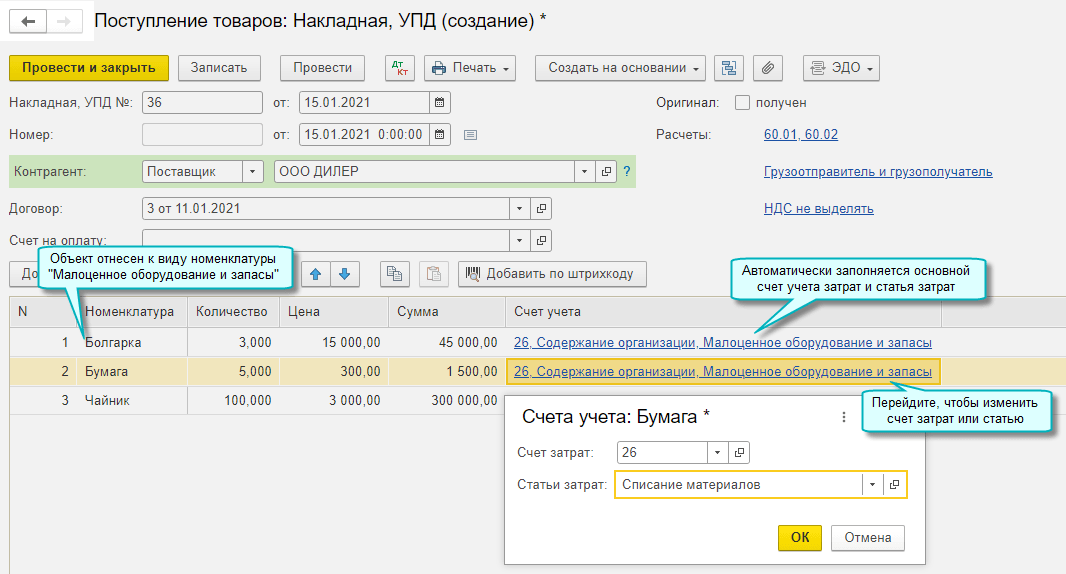Аналогичным образом для малоценного оборудования и запасов реализовано указание счета и аналитики затрат в документах: