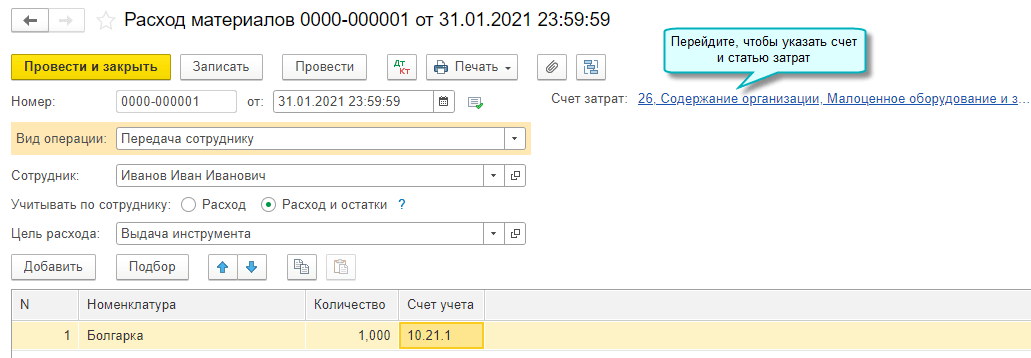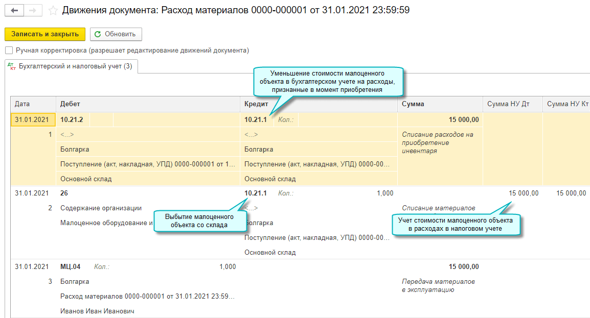 Для отражения в учете использования, передачи сотрудникам, перемещения, списания и реализации малоценного оборудования и запасов используются те же документы, что используются для обычных материалов. При этом автоматически будут формироваться необходимые проводки по субсчетам 10.21.1 и 10.21.2.