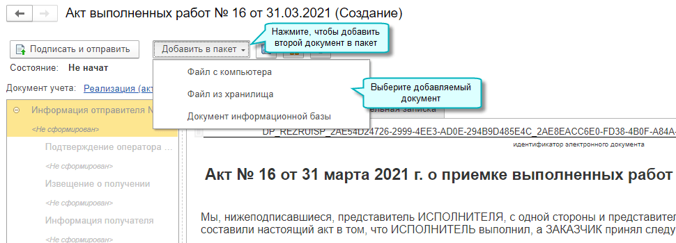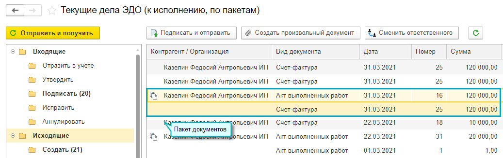 Добавлена возможность отправки и получения в ЭДО пакета документов. Данный функционал доступен для пользователей сервиса 1С-ЭДО.