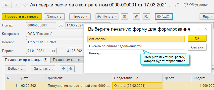 В ЭДО добавлена возможность отправлять печатные формы документов, для которых нет утвержденных форматов электронных форм. Перечень печатных форм, доступных для конкретного документа, открывается при нажатии кнопки "ЭДО".
