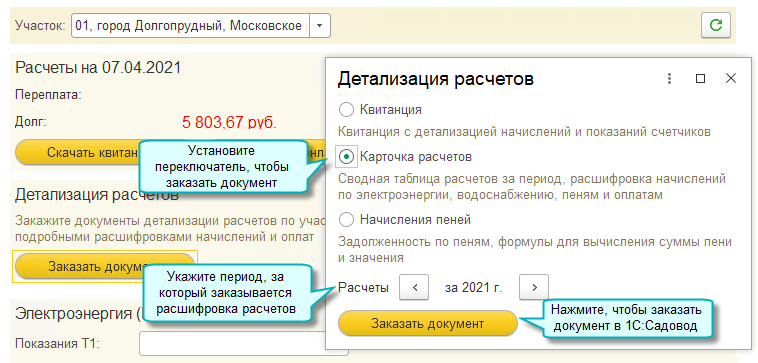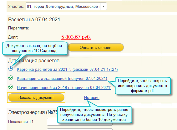 В Личный кабинет садовода добавлена возможность получения документов детализации расчетов по участку из 1С:Садовода. Для этого требуется их предварительный заказ.