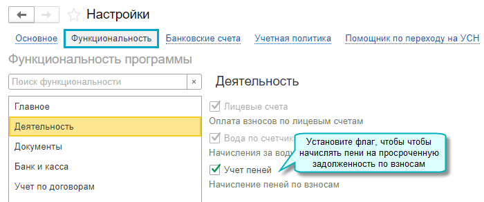 Документ по пеням формируется, если этот функционал используется в 1С:Садовод.