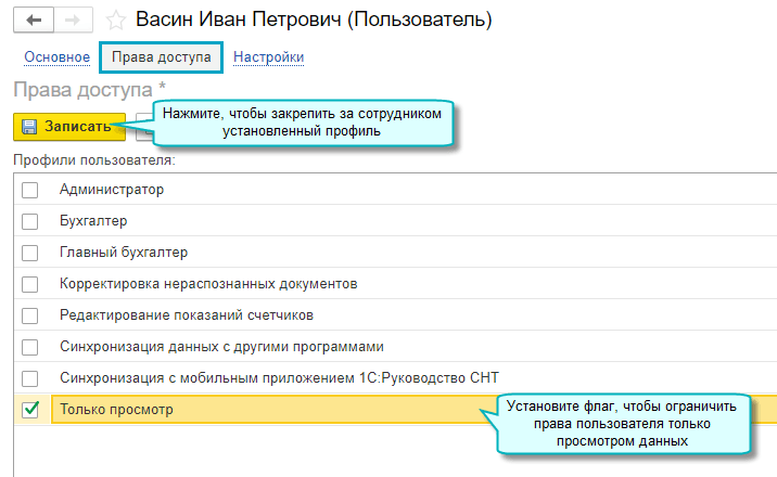Для председателя СНТ, если он предпочитает пользоваться мобильным приложением, укажите профиль Синхронизация с мобильным приложением 1С:Руководство СНТ. Тогда он сможет на телефоне просматривать задолженность, контакты садоводов.