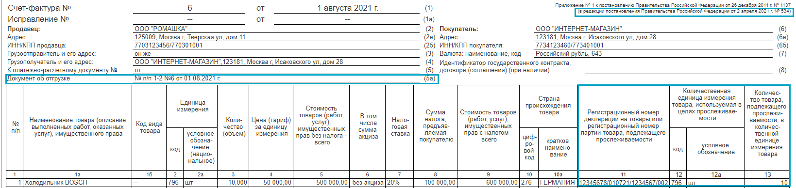 В форму счета-фактуры добавлена информация о накладной или акте, по которым он составлен, а также информация по прослеживаемости (Постановление Правительства РФ от 2 апреля 2021 г. № 534). Изменения действуют с 01.07.2021.