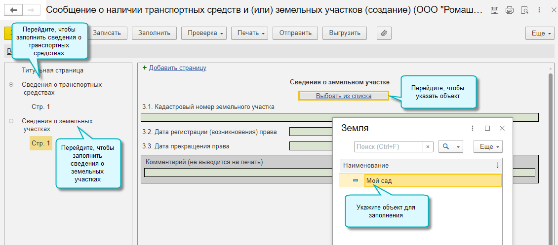 Добавлена возможность заполнения Сообщения о наличии транспортных средств и земельных участков.