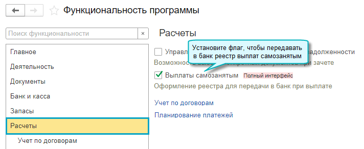 Простой интерфейс: меню "Настройки - Функциональность - Расчеты - Выплаты самозанятым".