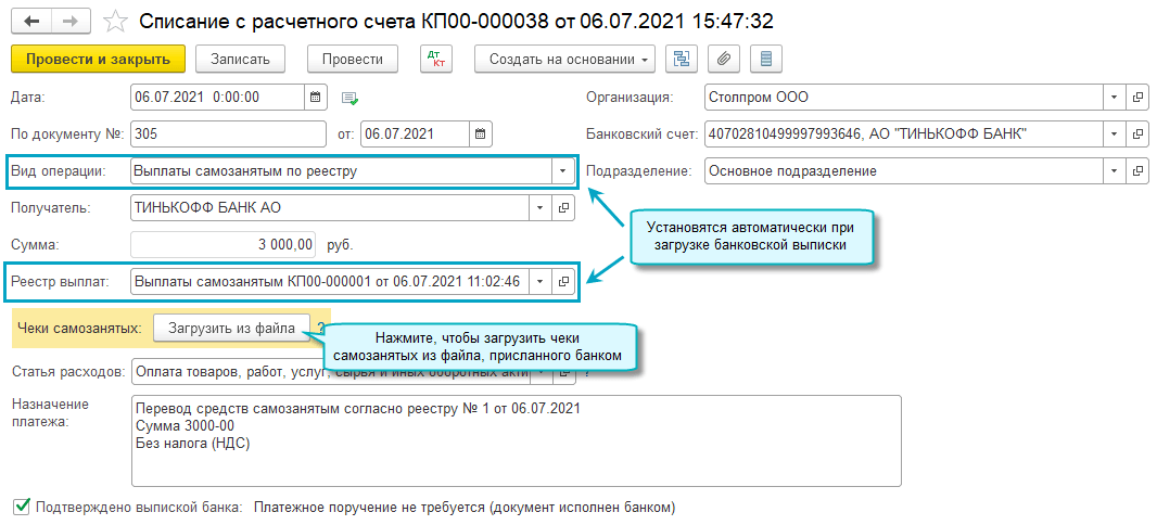 Добавлена возможность работы с сервисами банков по выплатам самозанятым. Реестр выплат самозанятым подготавливается и передается в банк. Банк перечисляет деньги на счета самозанятых и передает организации реестр ссылок на чеки самозанятых, которые загружаются в базу.