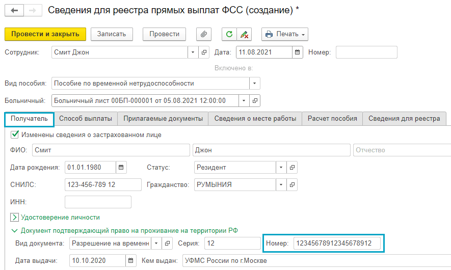 Расширен до 20 символов номер разрешения на временное проживание в РФ в Сведениях для реестра прямых выплат ФСС.