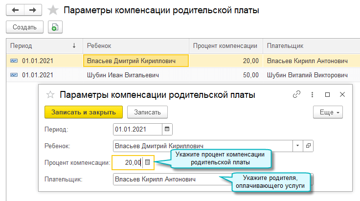 Полный интерфейс: меню "Деятельность - Услуги детям - Параметры компенсации родительской платы".
