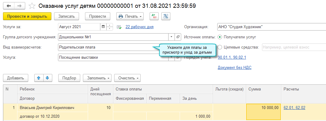 Полный интерфейс: меню "Деятельность - Услуги детям - Оказание услуг детям".