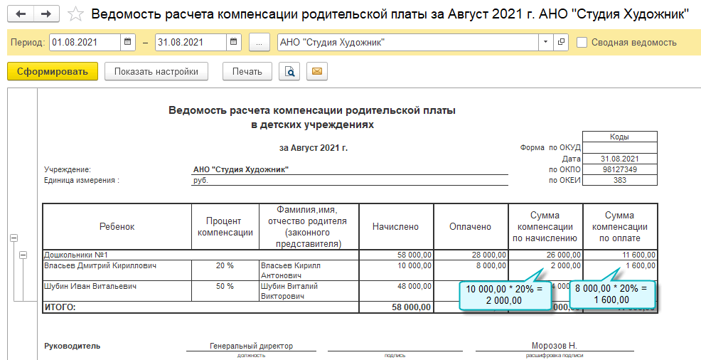 Полный интерфейс: меню "Деятельность - Отчеты - Ведомость расчета компенсации родительской платы".