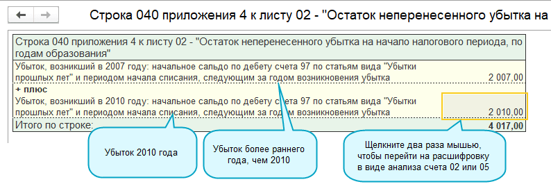 Добавлена возможность отражения и расшифровки в декларации по прибыли показателей убытков прошлых десяти лет и более.