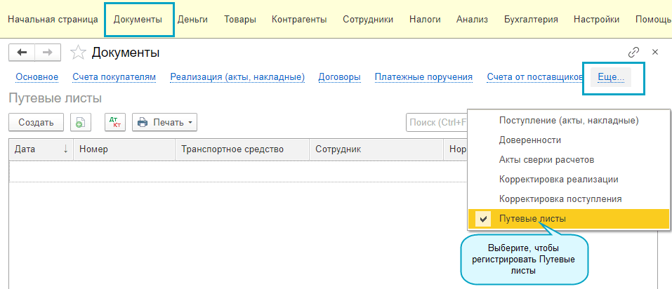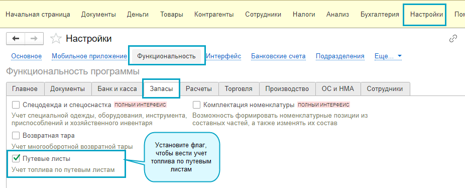 1. Включение учета Путевых листов