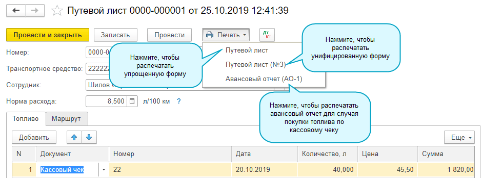 Путевой лист можно распечатать в унифицированной форме или в упрощенной.