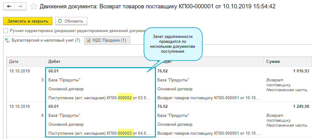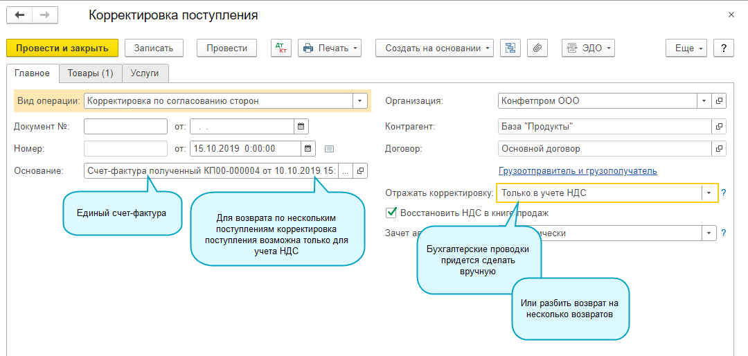 Добавлена возможность заполнять Возврат поставщику на основании нескольких документов поступления. А также возможность формирования единого корректировочного входящего счета-фактуры.