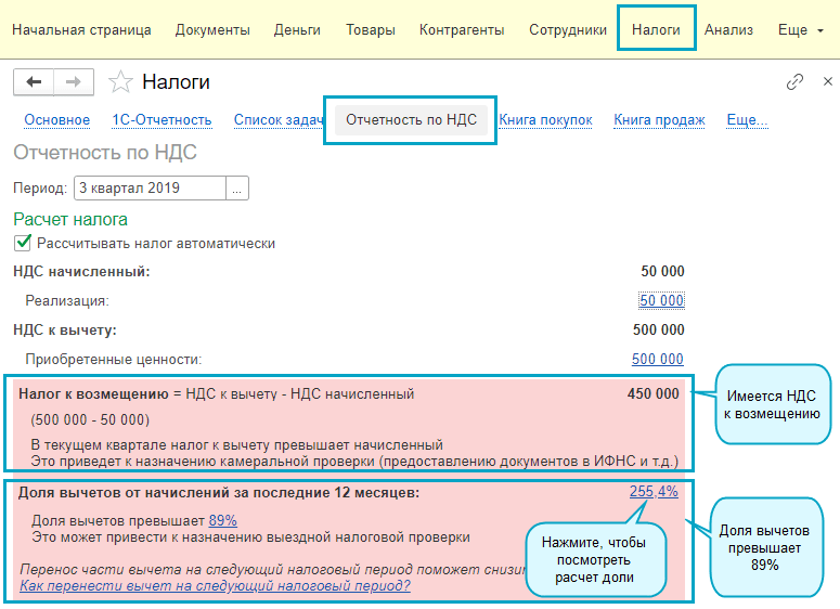 Добавлен контроль отражения в налоговой отчетности НДС значительных сумм налоговых вычетов. При формировании отчетности по НДС проверяются следующие показатели: