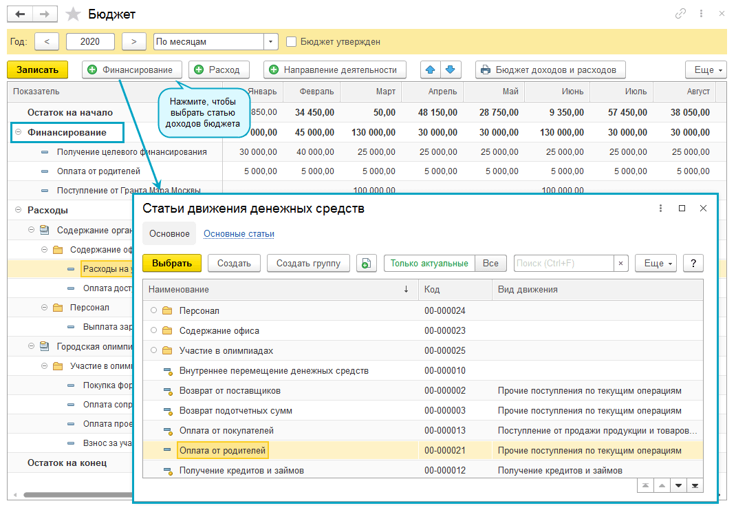 Для формирования доходной части бюджета выберите статью доходов.