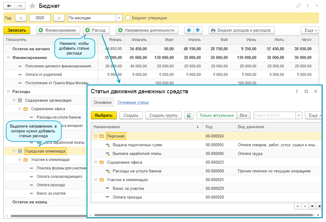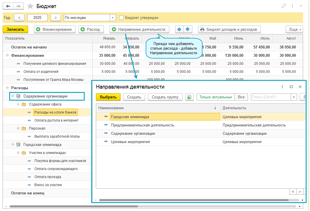Для формирования расходной части бюджета выберите Направления деятельности и статьи расходов.