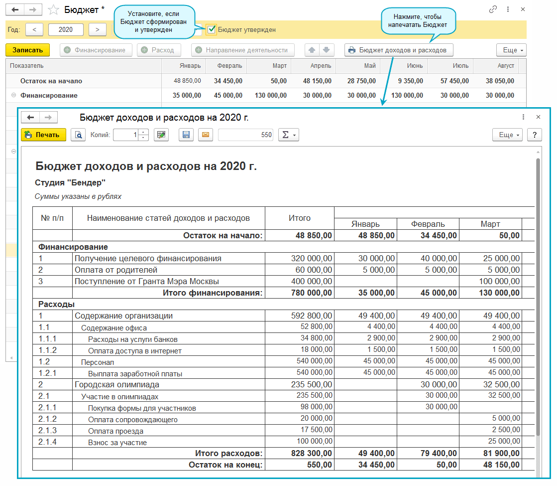 После формирования бюджета, его можно утвердить и распечатать.