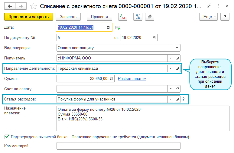 Регистрируйте в учете фактические поступления и расходы денежных средств, используя статьи ДДС.