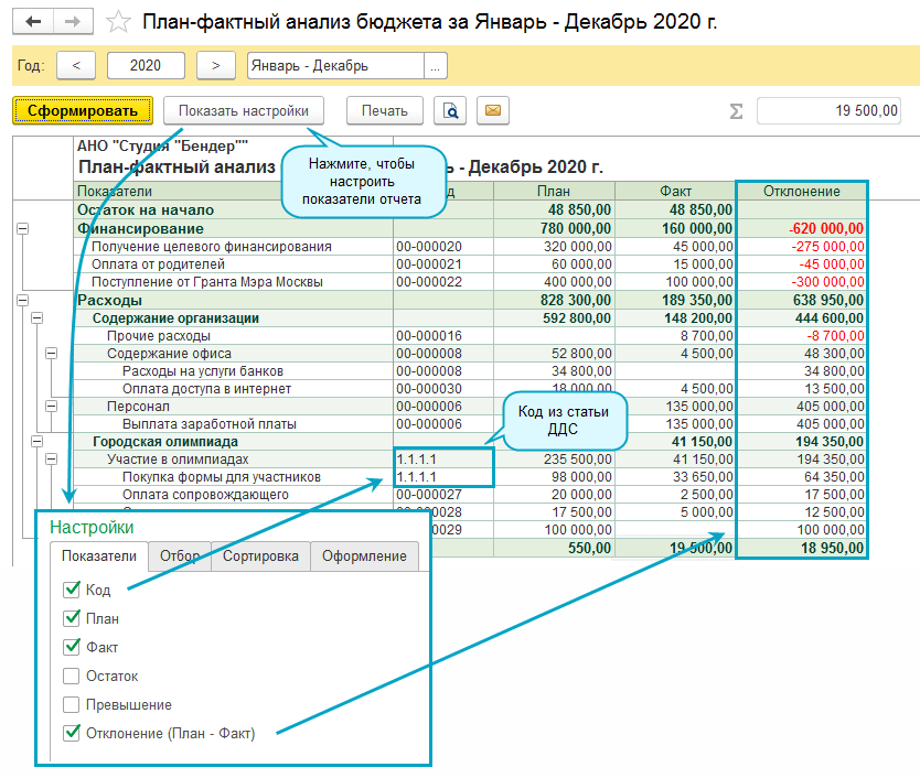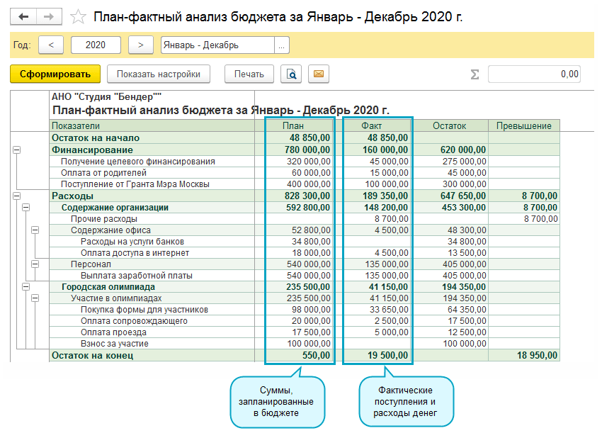 Формируйте план-фактный анализ бюджета, чтобы контролировать выполнение бюджета.