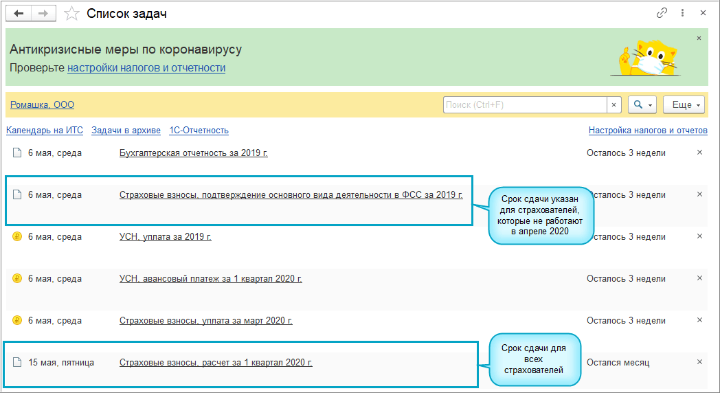 Срок сдачи 4-ФСС за 1 квартал 2020 г. перенесен на 15 мая 2020 года. Срок сдачи заявления о подтверждении основного вида деятельности перенесен на 6 мая 2020 г. только для страхователей, которые не работают в апреле 2020 года. Для страхователей, которые продолжают работать в апреле 2020 года - срок сдачи не позднее 15 апреля 2020 г. (Письмо ФСС России от 13.04.2020 № 02-09-11/06-06-8452).