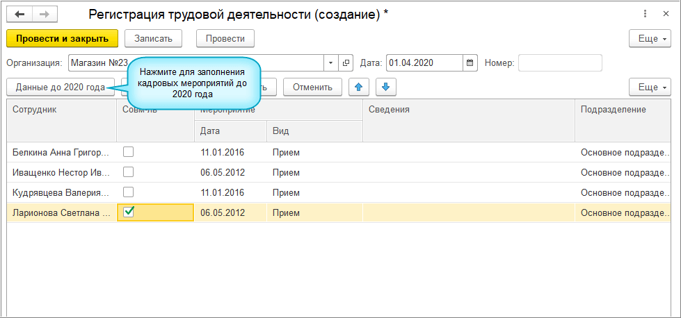 Кадровые события до 2020 года по уже имеющимся данным в программе заполняются автоматически в документе "Регистрация трудовой деятельности" по кнопке "Данные до 2020 года", на основании которого заполняется форма СЗВ-ТД. Зарегистрированные таким образом события будут использоваться для заполнения формы СЗВ-ТД на сотрудников, по которым отсутствовали кадровые мероприятия в 2020 году. Срок сдачи СЗВ-ТД по таким сотрудникам - не позднее 15 февраля 2021 года.