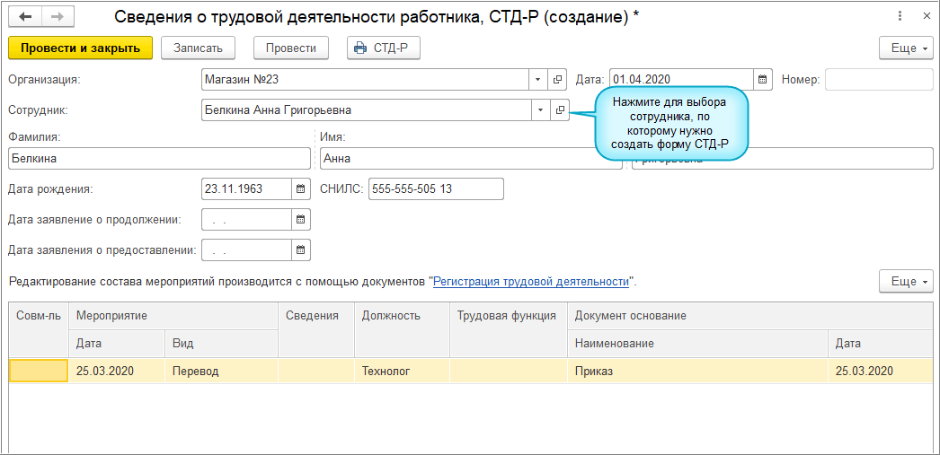 Форма СТД-Р заполняется только по кадровым мероприятиям, которые переданы в ПФР (СЗВ-ТД с флажком "Пачка принята в ПФР (не редактируется)").