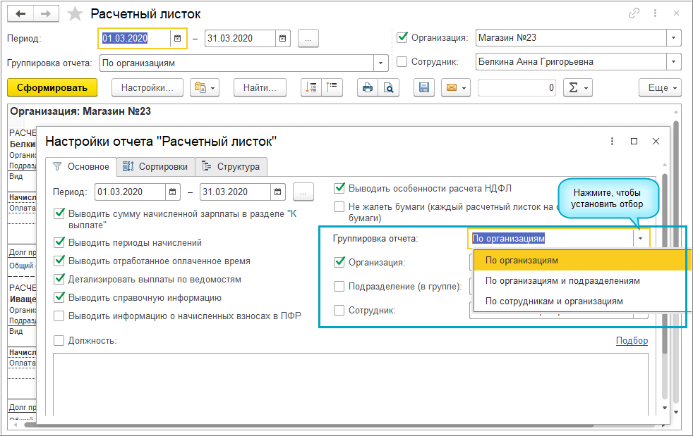 Добавлена возможность группировать расчетные листки по организациям, организациям и подразделениям, по сотрудникам и организациям.