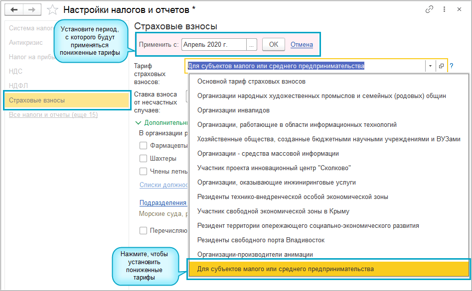 Добавлена возможность установить пониженные тарифы страховых взносов в отношении выплат в пользу физических лиц для страхователей, признаваемых субъектами малого и среднего предпринимательства (Федеральный закон от 01.04.2020 № 102-ФЗ).