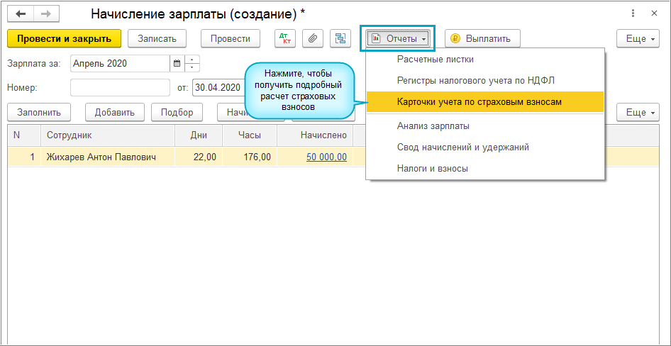 Полный интерфейс: меню "Главное - Налоги и отчеты - Страховые взносы".
