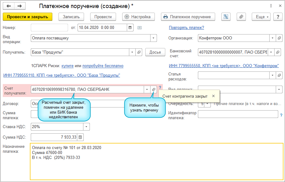 Добавлена возможность контроля статуса расчетного счета в документах Платежное поручение и Счет покупателю.