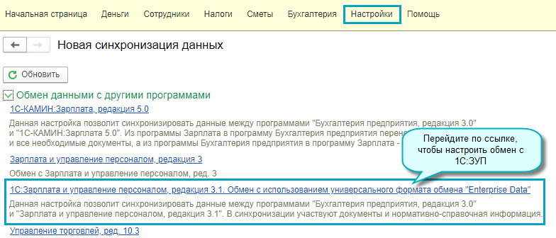 Добавлена возможность синхронизации с конфигурацией 1С:Заработная плата и управление персоналом с использованием универсального формата обмена Enterprise Data. В отличие от предыдущей версии новый формат поддерживает обмен между приложениями, работающими в разных сервисах. Рекомендуем использовать именно этот формат при настройках обмена.
